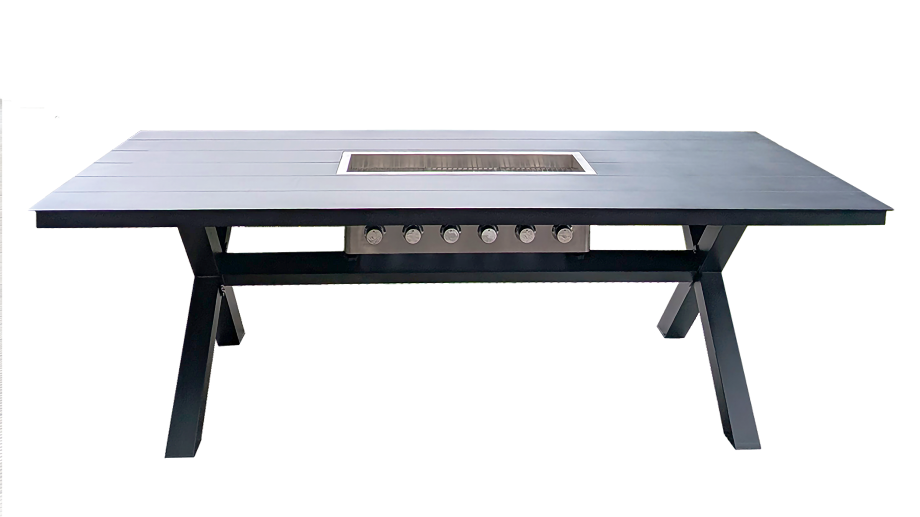 Grill mit 6 Brennern und Glas-Abdeckungen, Grilleinsatz, 3 herausnehmbare Edelstahlroste, Eichen- oder Walnusstisch in ausgewählter Größe mit schwarzen Edelstahl-X-Beinen, Holz-Inlet mit eingelassenen Magneten und 2 Stk. Holz-Griffe mit Magneten zum Herausheben des Holz-Inlets, Outdoor-Cover zum Abdecken des Tisches